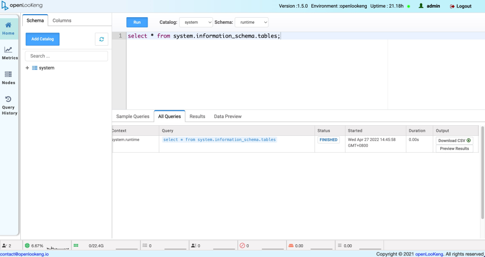 开启https和jwt认证后,openLooKeng的UI界面就无法使用了,所以需要结合openLooKeng客户端来查看内部数据。具体操作如下: