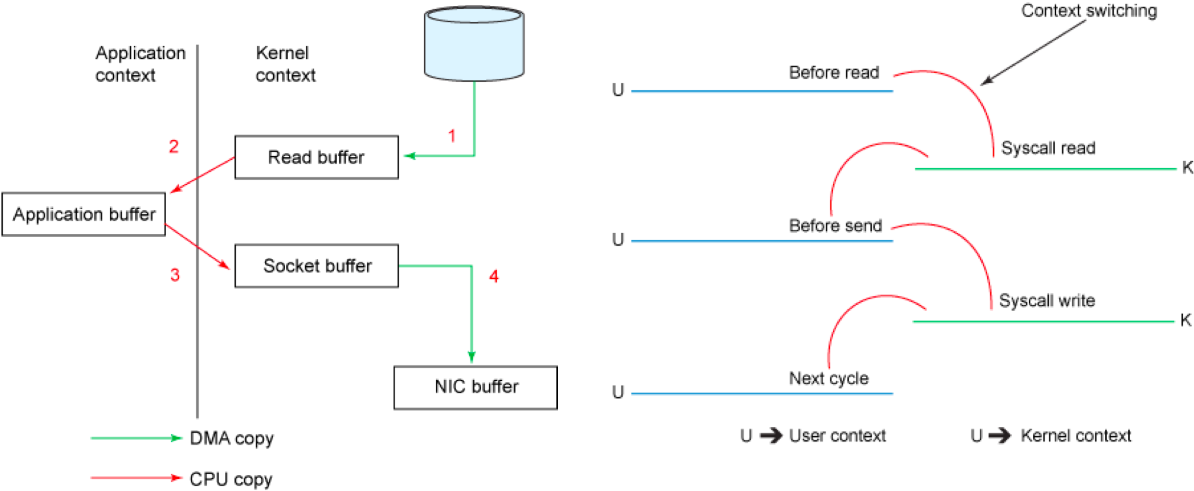 这一过程实际上发生了四次数据拷贝。首先通过系统调用将文件数据读入到内核态 Buffer(DMA 拷贝),然后应用程序将内存态 Buffer 数据读入到用户态 Buffer(CPU 拷贝),接着用户程序通过 Socket 发送数据时将用户态 Buffer 数据拷贝到内核态 Buffer(CPU 拷贝),最后通过 DMA 拷贝将数据拷贝到 NIC Buffer。同时,还伴随着四次上下文切换,如下图所示: