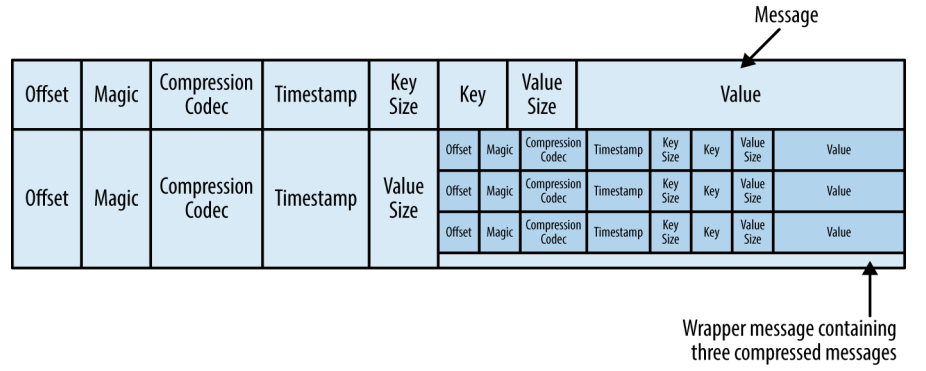 通常保存在磁盘上的数据格式与生产者发送过来消息格式是一样的。 如果生产者发送的是压缩过的消息,那么同一个批次的消息会被压缩在一起,被当作“包装消息”进行发送 (格式如下所示) ,然后保存到磁盘上。之后消费者读取后再自己解压这个包装消息,获取每条消息的具体信息。