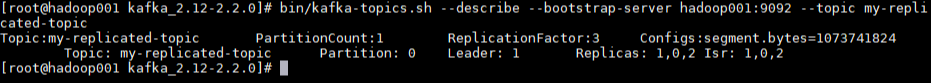 这里给出一个主题创建的示例:使用 --replication-factor 指定副本系数为 3,创建成功后使用 --describe  命令可以看到分区 0 的有 0,1,2 三个副本,且三个副本都在 ISR 列表中,其中 1 为首领副本。