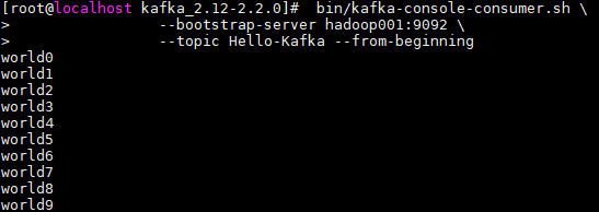 # bin/kafka-console-consumer.sh --bootstrap-server hadoop001:9092 --topic Hello-Kafka --from-beginning